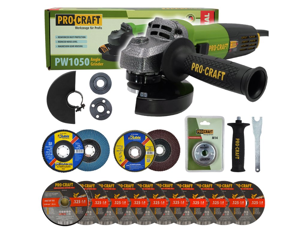 Bruska úhlová Procraft PW1050 + rychloupínací matice, 10x řezný kotouč, 2x lamelový kotouč | SPW1050/RM14