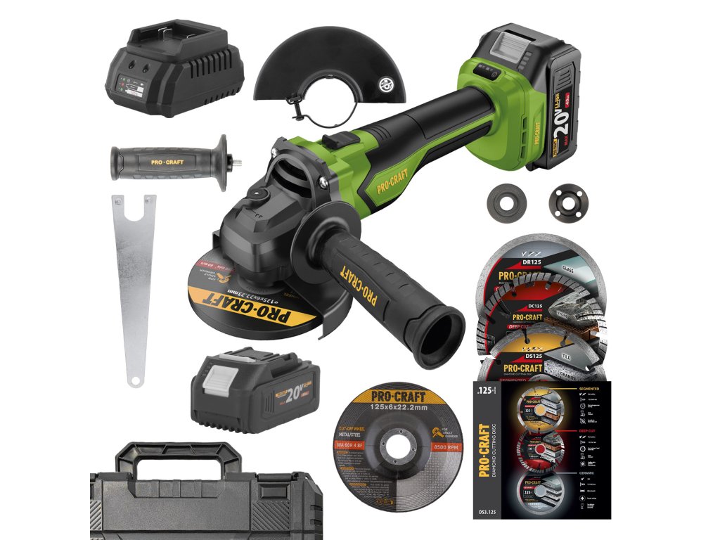 Sada aku úhlová bruska Procraft PGA22 a 3x diamantové kotouče Procraft DS3.125Aku úhlová bruska Procraft PGA22 s bezuhlíkovým motorem, třemi rychlostmi (3500/6000/8000 ot./min) a průměrem kotouče 125 mm. Lehká (1,5 kg), s regulací otáček a protiskluzovým povrchem.Součástí balení - kufr, montážní klíč, ochranný kryt, přídavná rukojeť, brusný kotouč 125mm, baterie 20V 4Ah, nabíječky.